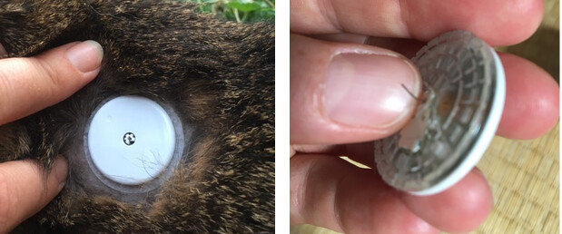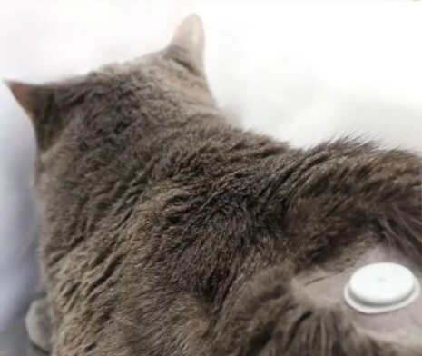 Le capteur est collé sur la peau du chat (un petit filament souple passe sous la peau : c’est indolore). La pose se fait sans anesthésie et on peut apprendre à le faire à la maison.