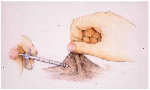 - on tient la seringue entre deux doigts (sans appuyer sur le piston)