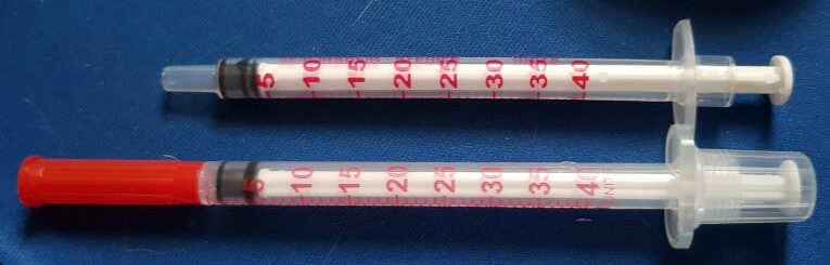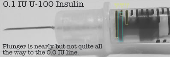 Il est donc crucial de savoir si c’est une seringue U-100 ou U-40 (1 UI n’occupe pas le même volume de solution dans l’une ou l’autre seringue) et d’utiliser la seringue qui est prévue pour la concentration de l’insuline qu’on utilise.