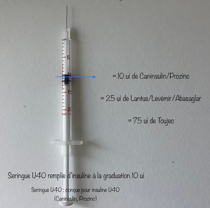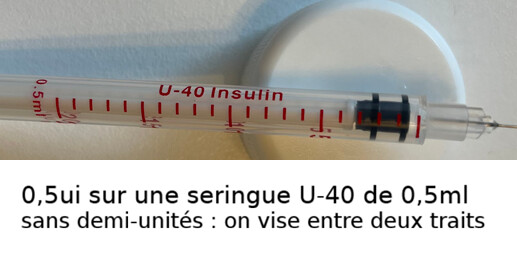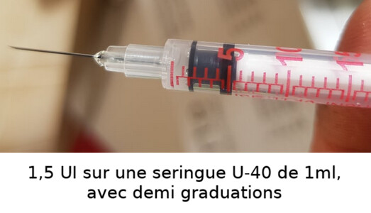 Attention, danger de surdosage ! Chaque unité de la seringue U-40 correspond à 2,5 UI de l’insuline U-100. Vraiment pas recommandé si les doses sont petites.