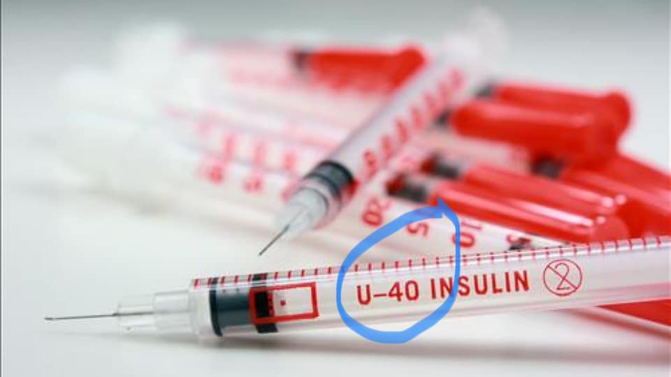 Parfois, des membres arrivent avec des seringues graduées en ml et des instructions de dosage dans ces mêmes unités. Pour transformer ces volumes en UI, il faut se souvenir de la définition de « U-40 » et « U-100 » : 40 unités dans un ml ou 100 unités dans un ml.