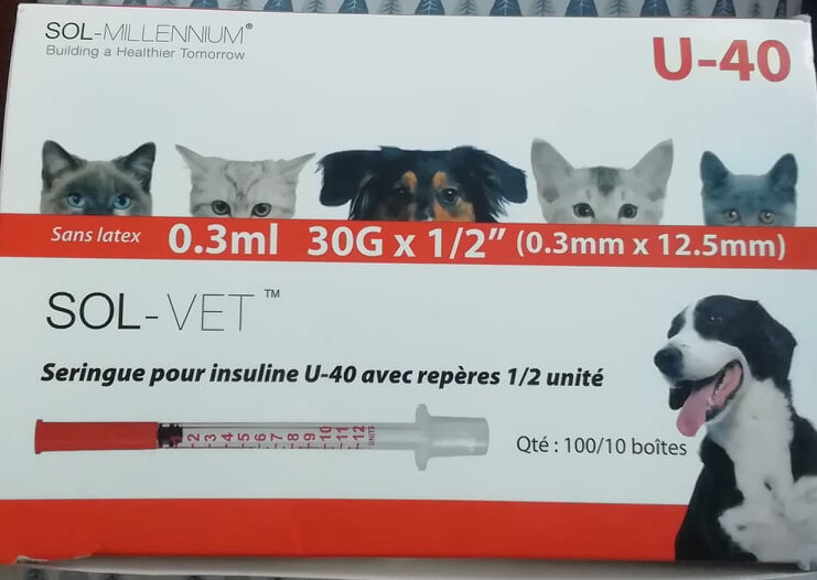 N’achetez pas les fioles (10 ml = 1000 UI) à moins de donner une dose très importante d’insuline à votre chat !