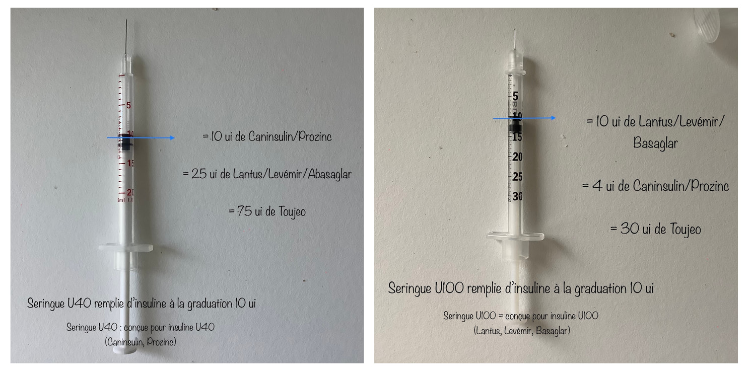 - on n’a pas les bonnes seringues à disposition, ce qui peut amener à injecter de l’insuline U-100 avec des seringues U-40.