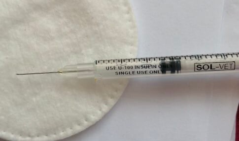 - si votre chat réagit à l’injection et que vous n’utilisez pas une aiguille 30G ou 31G, changez d’abord la taille de votre aiguille pour une taille adaptée ; de même, si votre chat réagit et que vous réutilisez vos aiguilles, tentez l’usage unique !